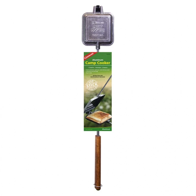 Coghlan’s Camp Cooker is een tosti-ijzer met een lang houten handvat. Een handige manier om te koken boven een open vuur!