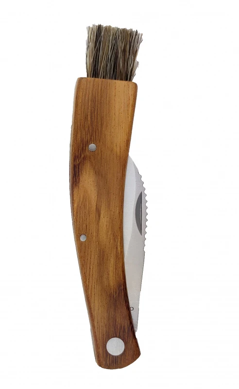Een praktisch paddestoelenmes met een gebogen lemmet, houten handvat en een kwastje. Perfect om mee te nemen tijdens de paddenstoelenjacht in de herfst.