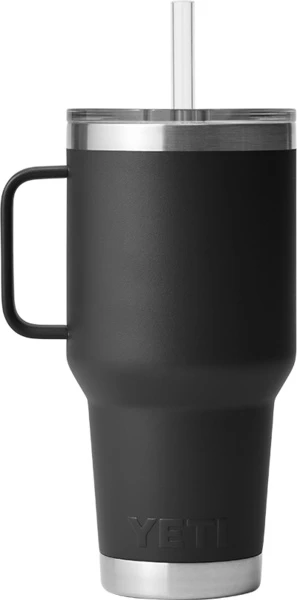 Yeti Rambler 35 Oz Straw Mug – Black is een grote thermosbeker met een rietje en oor voor een goede grip. Houdt uw drankje koud en is gemakkelijk schoon te maken met zijn machine vaatwasserbestendige ontwerp!